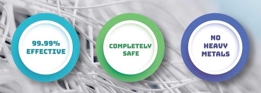 How the antimicrobial function works is a simple three-step process. First, the bacteria or viruses are captured in the dense nanofiber network, just as in any other passive filtration material. And then, in our process, there is a flash of blue visible light, not UV, on the membrane to activate it. The light activates the photosensitizer molecules in the fibers, transforming molecular oxygen into its reactive form, which in turn kills bacteria or viruses captured within the nanofiber network. In short, it’s a safer self-cleaning alternative of a simple, passive barrier filter.