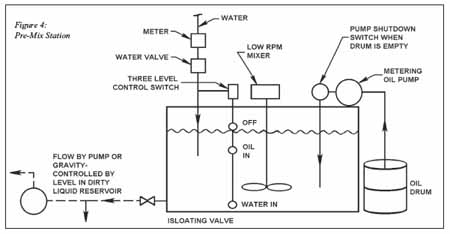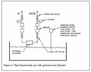Figure 2 reflects a dual liquid make-up unit, which can provide an automatic input of both liquids. It senses a “make-up on” level in the tank and adds a monitored amount of water and a related amount of oil. The bubbler level controller could also include two more levels for low and high level alarms.