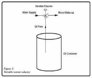 Figure 3 indicates an adjustable venturi educator, which pulls a controlled amount of oil from the drum (tote) as water flows through the eductor. The venturi is adjustable so the amount of oil blended with the water can be changed.