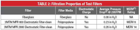 To study the effectiveness of HVAC filtration on the indoor air quality, three different types of filters were tested: fiberglass, Filtrete MPR 800, and Filtrete MPR 2800 filters.