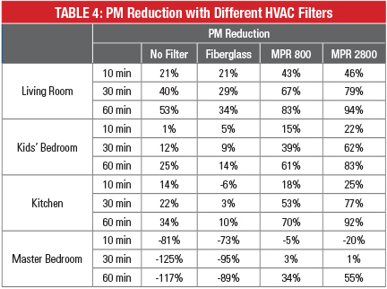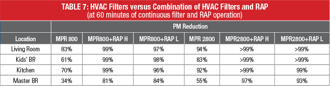 To better understand the impact of Filtrete room air purifier on the whole house PM reduction, PM reductions with Filtrete MPR 800 and MPR 2800 filters and with the combination of Filtrete HVAC filters and RAP are shown in Table 7. It is clearly seen that Filtrete room air purifiers not only effectively reduced particle concentration in a single room, but also significantly improved PM reduction in other spaces of the house. In other words, combination of Filtrete HVAC filters and Filtrete room air purifiers delivered the most effective PM reduction in the whole house.