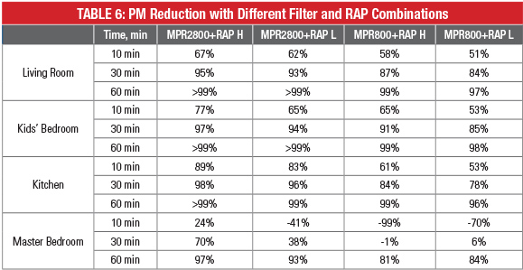 Table 6 shows the numerical values of the PM reduction in different rooms at 10 minutes, 30 minutes and 60 minutes of the HVAC system and RAP operation. It is obvious to see advantage of the high efficiency HVAC filter (MPR 2800) over the medium efficiency filter (MPR 800).