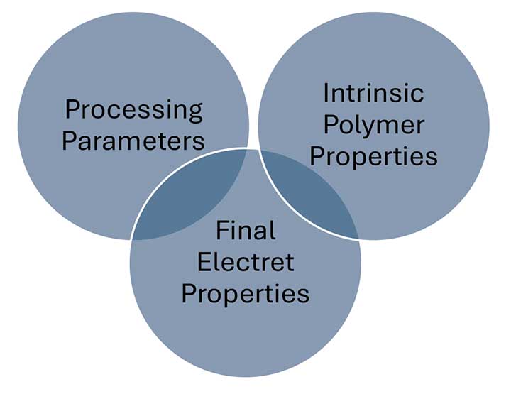 To evaluate the potential of biopolymers for electrostatic fiber applications, their electrical, mechanical, thermal, and structural properties must be examined, as electret performance depends on both intrinsic polymer characteristics and fiber manufacturing conditions (Figure 2).