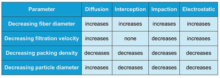 Table 1 summarizes how some important filtration parameters effect key filtration mechanisms, revealing that while a reduction in fiber diameter enhances efficiency across all four mechanisms, a decrease in filtration velocity produces more nuanced effects: diffusion and electrostatic attraction increase, interception remains unchanged, and impaction declines1, 2, 3. Understanding these interactions is critical for optimizing filter design, particularly because their combined effects typically result in a most penetrating particle size (MPPS) between 100–300 nm, representing the most challenging particles to capture efficiently.