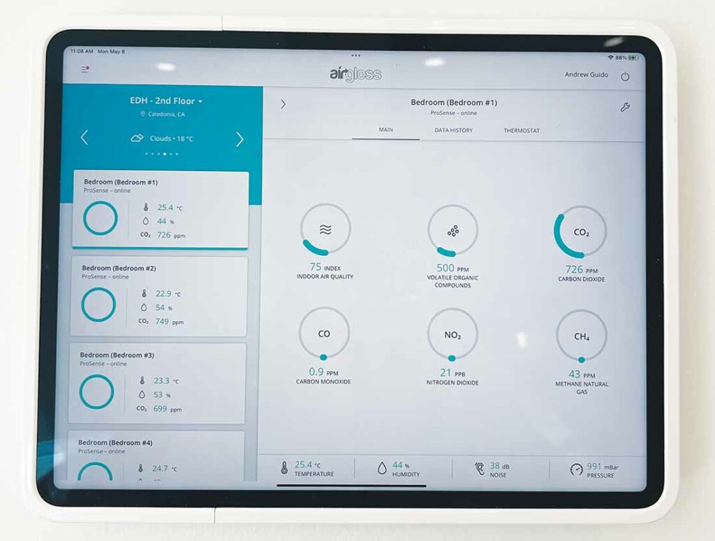 At the ERTH360 Discovery Home, 13 strategically located sensors monitor indoor conditions, and an outdoor sensor provides early warnings for potential hazardous events. These sensors will eventually integrate with HVAC and other systems to maintain targeted indoor air quality conditions autonomously.