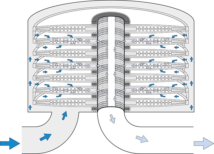 The resulting damage can be either extensive and obvious in nature or consist of micro-cracks that are not visible to the naked eye. In either case, proper filtration is no longer possible, or at least can no longer be guaranteed without the risk of a bypass. This restriction to a single direction of flow affects the service life: Due to the lack of backflushing, the effects of cleaning are limited, which reduces the overall service life of the stacked disc cartridge.