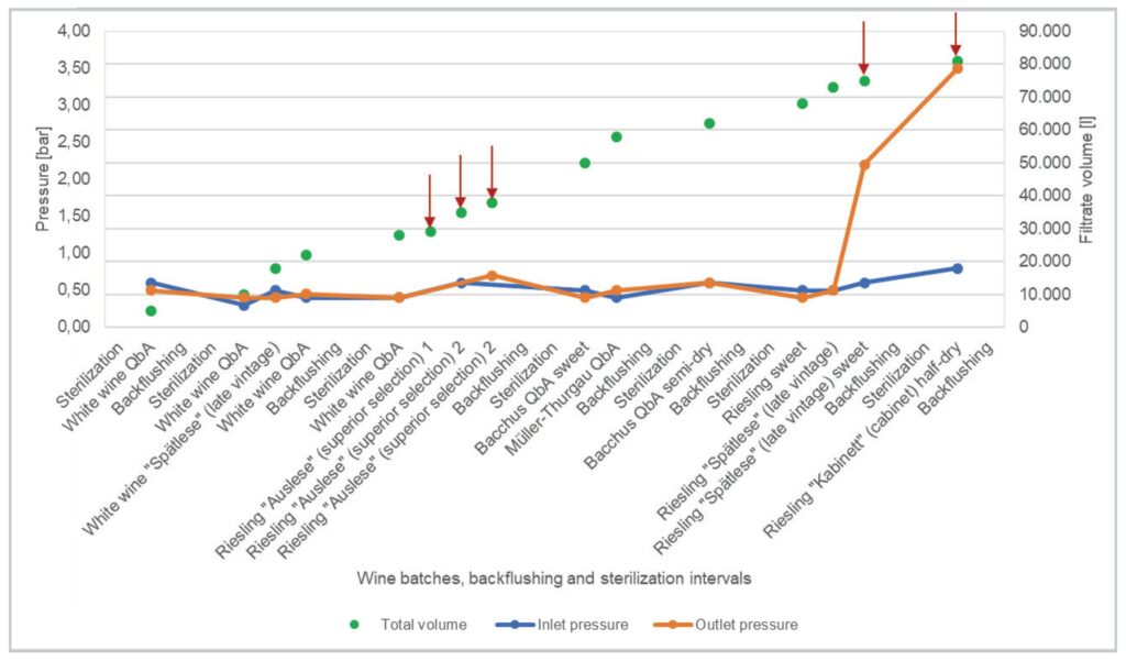 The measurement results of the pressure recording on the inlet and outlet are shown in Figure 4. The differential pressure between the filter inlet and outlet at the beginning and end of each filtration cycle is shown in two graph lines (blue = inlet pressure and orange = outlet pressure). The associated values are entered on the primary left Y-axis (pressure). The filtrate volume can also be viewed. The values for this can be found in the secondary right Y-axis (filtrate volume). The X-axis shows the name of the filtered wine. In addition, the backflushing and sterilization processes are noted on this axis. The red arrows included indicate the difficult to filter wine batches (filter index ≤ 0.4 gal or 1500 ml, see tab. 1).