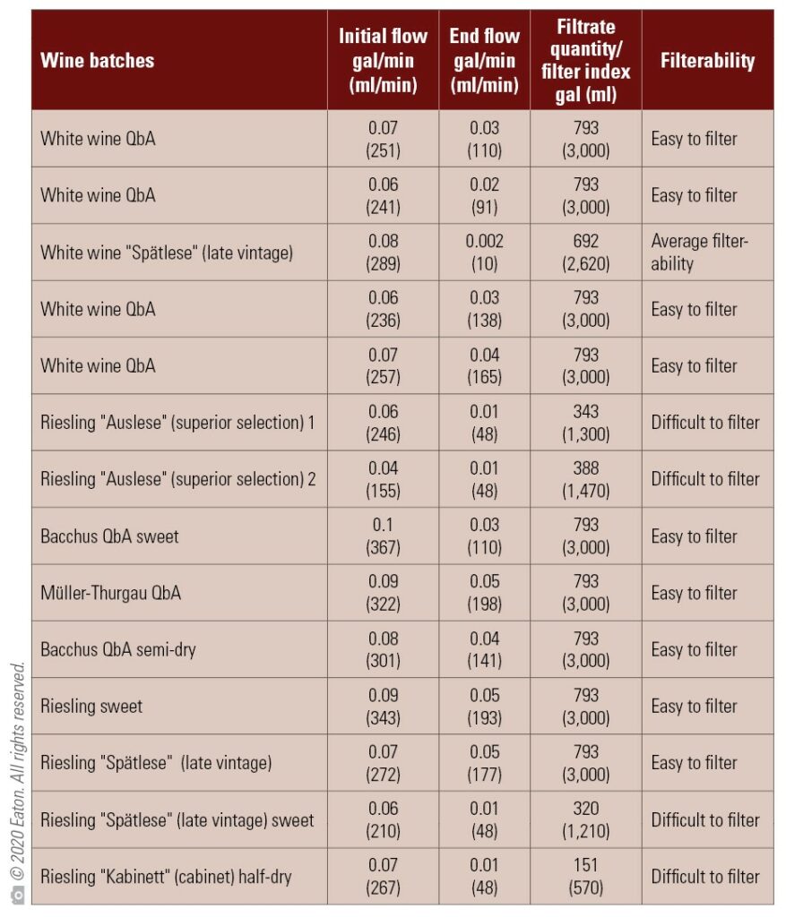 The results of the index measurement of all 14 batches of wine in the test are shown in Table 1 (see page 23). Nine batches of wine were classified as easy to filter, one of average filterability and four were difficult.